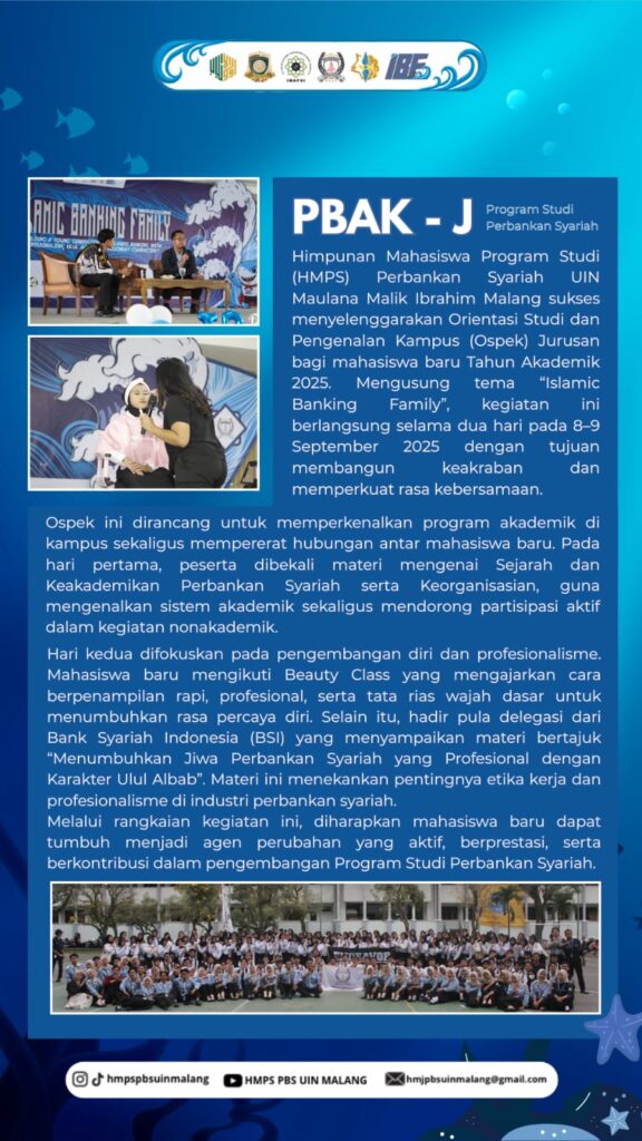 Himpunan Mahasiswa Program Studi (HMPS) Perbankan Syariah UIN Maulana Malik Ibrahim Malang sukses menggelar Orientasi Studi & Pengenalan Kampus Jurusan (PBAK-J) pada 8–9 September 2025. Dengan mengusung tema “Islamic Banking Family”, kegiatan ini dirancang untuk:✅ Memperkenalkan program akademik & sistem kampus 📚✅ Menguatkan kebersamaan & hubungan antar mahasiswa baru 🤝✅ Mengembangkan potensi diri & profesionalisme […]